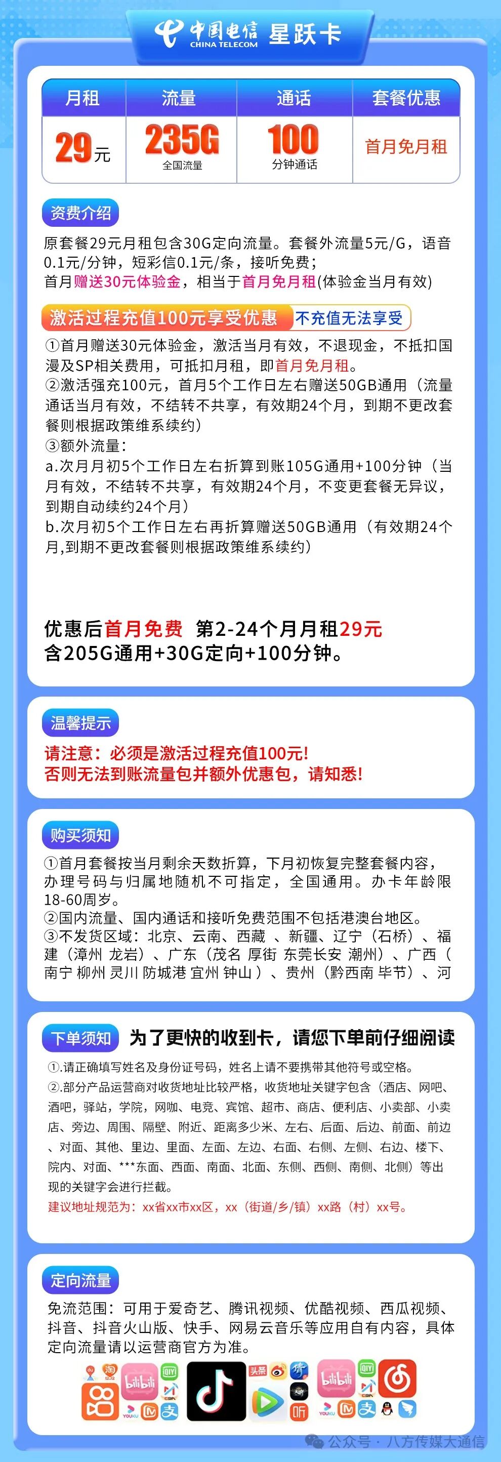 电信星跃卡29元235G+100分钟 复制资料